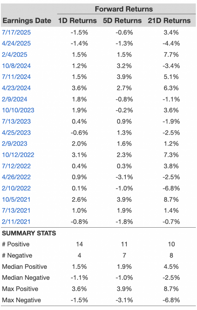 - There are 18 earnings data points recorded over the last five years, with 14 positive and 4 negative one-day (1D) returns observed. In summary, positive 1D returns were seen about 78% of the time.