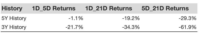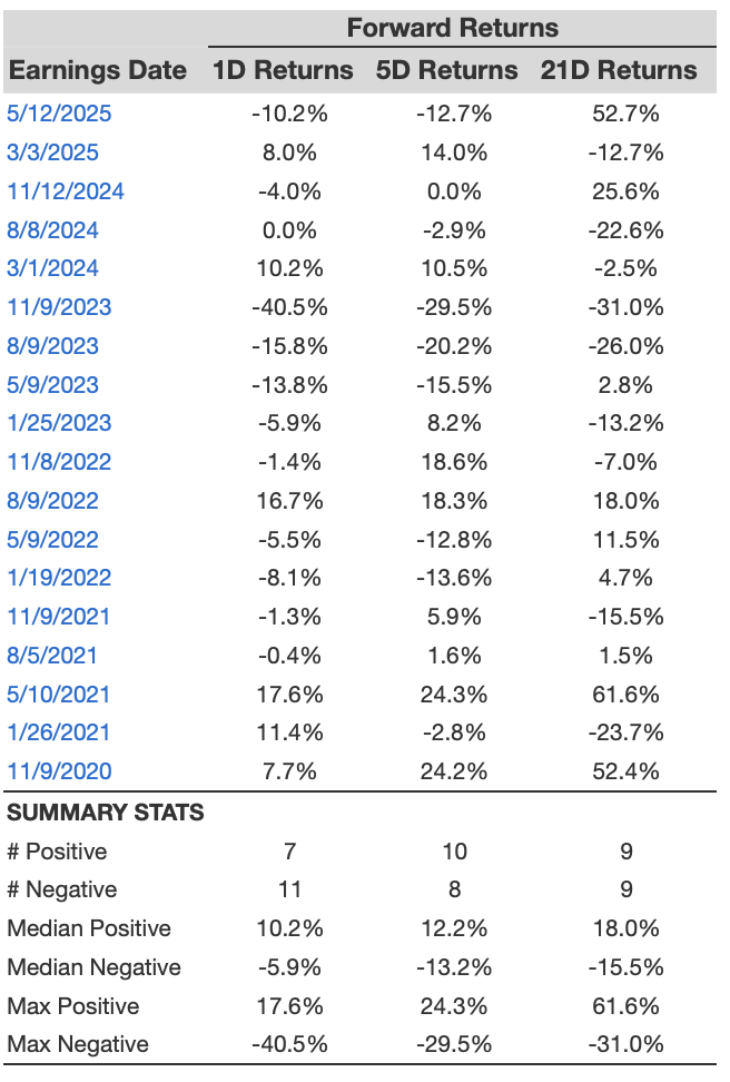 - There are 18 earnings data points recorded over the last five years, with 7 positive and 11 negative one-day (1D) returns observed. In summary, positive 1D returns were seen about 39% of the time.