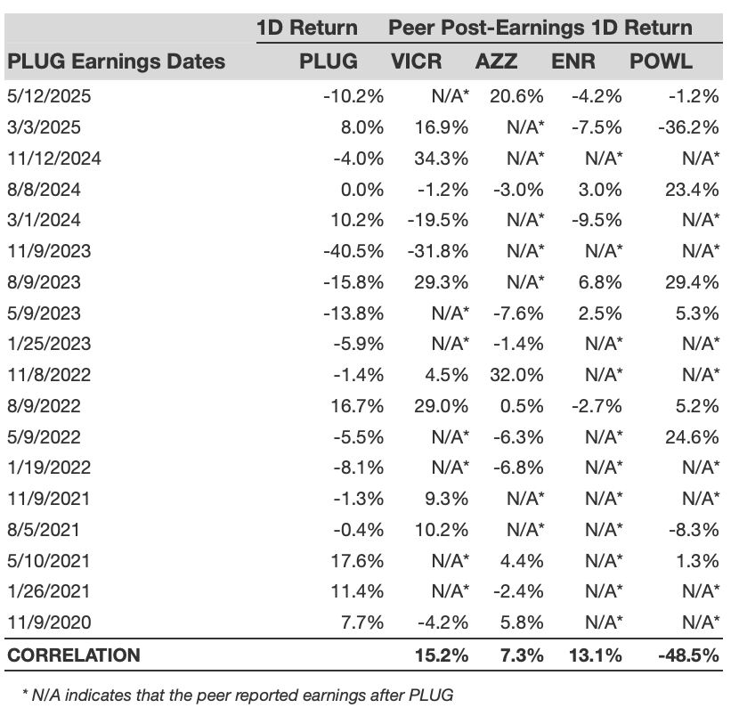 Sometimes, peer performance can have an influence on post-earnings stock reaction. In fact, the pricing-in might begin before the earnings are announced. Here is some historical data on the past post-earnings performance of Plug Power stock compared with the stock performance of peers that reported earnings just before Plug Power. For fair comparison, peer stock returns also represent post-earnings one-day (1D) returns.