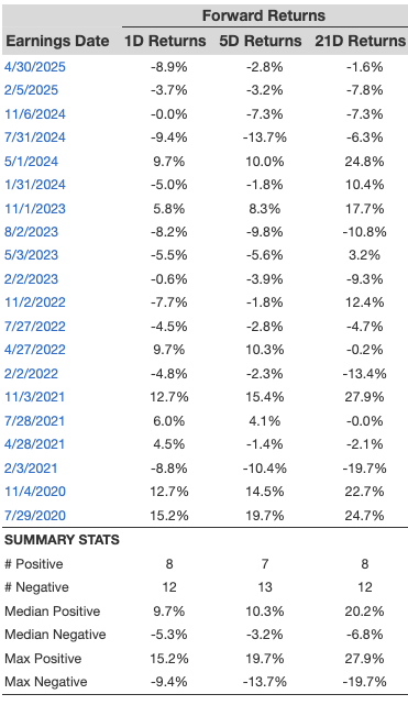 - There are 20 earnings data points recorded over the last five years, with 8 positive and 12 negative one-day (1D) returns observed. In summary, positive 1D returns were seen about 40% of the time.