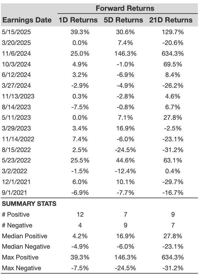 - There are 16 earnings data points recorded over the last five years, with 12 positive and 4 negative one-day (1D) returns observed. In summary, positive 1D returns were seen about 75% of the time.