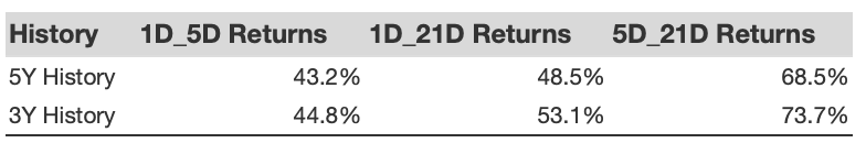 A relatively less risky strategy (though not useful if the correlation is low) is to understand the correlation between short-term and medium-term returns post earnings, find a pair that has the highest correlation, and execute the appropriate trade. For example, if 1D and 5D show the highest correlation, a trader can position themselves “long” for the next 5 days if the 1D post-earnings return is positive. Here is some correlation data based on a 5-year and a 3-year (more recent) history. Note that the correlation 1D_5D refers to the correlation between 1D post-earnings returns and subsequent 5D returns.