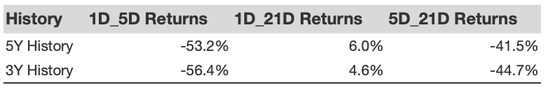 A relatively less risky strategy (though not useful if the correlation is low) is to understand the correlation between short-term and medium-term returns post earnings, find a pair that has the highest correlation, and execute the appropriate trade. For example, if 1D and 5D show the highest correlation, a trader can position themselves “long” for the next 5 days if the 1D post-earnings return is positive. Here is some correlation data based on a 5-year and a 3-year (more recent) history. Note that the correlation 1D_5D refers to the correlation between 1D post-earnings returns and subsequent 5D returns. Also, see – Can Rigetti Computing Stock See Another Tenfold Increase?