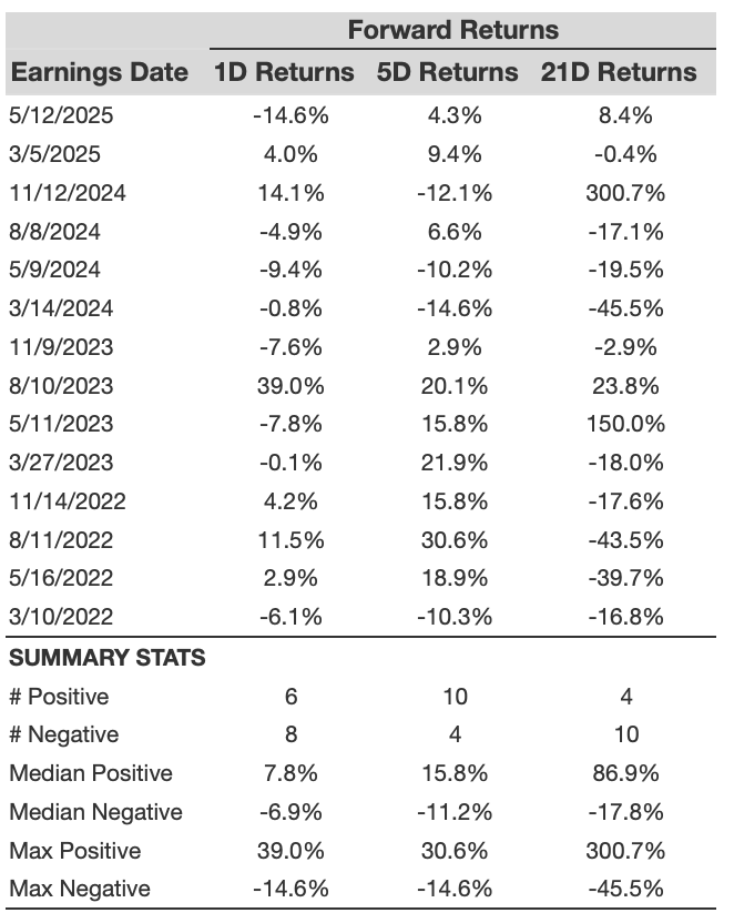 - There are 15 earnings data points recorded over the last five years, with 6 positive and 9 negative one-day (1D) returns observed. In summary, positive 1D returns were seen about 40% of the time.