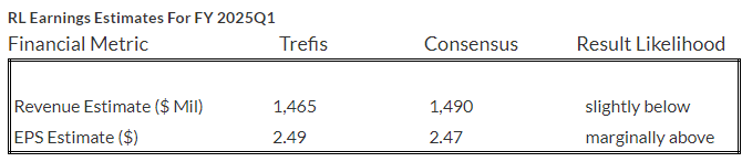 Trefis estimates RL’s Q1 2025 revenues to be around $1.5 Bil, slightly below the consensus estimate. For its fiscal 2024 fourth quarter, the luxury retailer saw revenue grow 2% year-over-year (y-o-y) to $1.6 billion, driven by a 7% growth in Asia sales alongside a 2% rise in both European and North American sales. The company benefited from continued strength in DTC and better-than-expected sequential improvement in wholesale business. It should be noted that RL’s inventory was down 16% from the prior year period to $902 million in Q4. On the balance sheet, RL ended Q4 with roughly $1.8 billion in cash and short-term investments and around $1.1 billion in long-term debt. We now forecast Ralph Lauren’s Revenues to be $6.8 billion for the full year 2025, up 3% y-o-y.