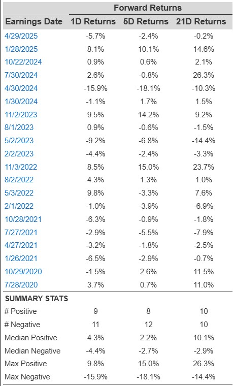 - There are 20 earnings data points recorded over the last five years, with 9 positive and 11 negative one-day (1D) returns observed. In summary, positive 1D returns were seen about 45% of the time.