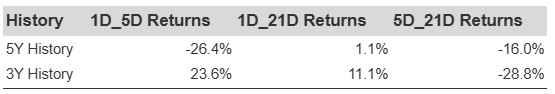 Additional data for observed 5-Day (5D), and 21-Day (21D) returns post earnings are summarized along with the statistics in the table below.