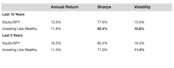 SPY delivered higher raw returns over the last decade (13.5% vs 11.8%), but the HNW-style portfolio was far smoother, with volatility of just 10.6% compared to 15.5%. That lower volatility translated into a meaningfully higher Sharpe ratio (92.4% vs 77.6%), meaning better returns per unit of risk. In other words, while you would have given up some annualized return versus going all-in on SPY, you would have massively reduced portfolio volatility while maintaining cash liquidity. That’s might be the essence of smart asset allocation – accepting slightly lower raw returns in exchange for a higher risk-adjusted payoff.