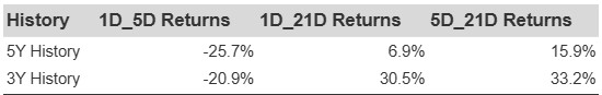 Additional data for observed 5-Day (5D), and 21-Day (21D) returns post earnings are summarized along with the statistics in the table below.