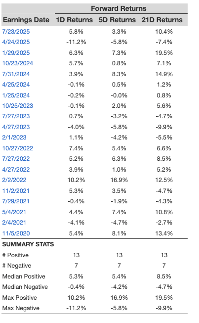 - There are 20 earnings data points recorded over the last five years, with 13 positive and 7 negative one-day (1D) returns observed. In summary, positive 1D returns were seen about 65% of the time.