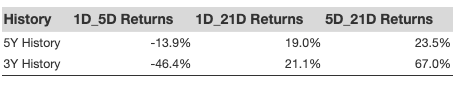 Additional data for observed 5-Day (5D) and 21-Day (21D) returns post earnings are summarized along with the statistics in the table below.