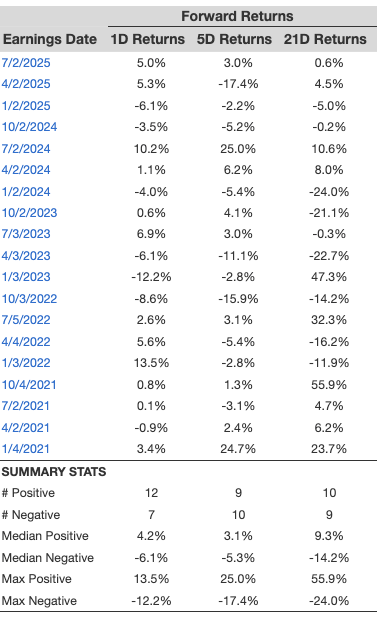 - There are 19 earnings data points recorded over the last five years, with 12 positive and 7 negative one-day (1D) returns observed. In summary, positive 1D returns were seen about 63% of the time.