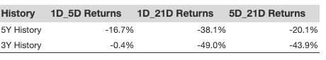 Additional data for observed 5-Day (5D) and 21-Day (21D) returns post earnings are summarized along with the statistics in the table below.