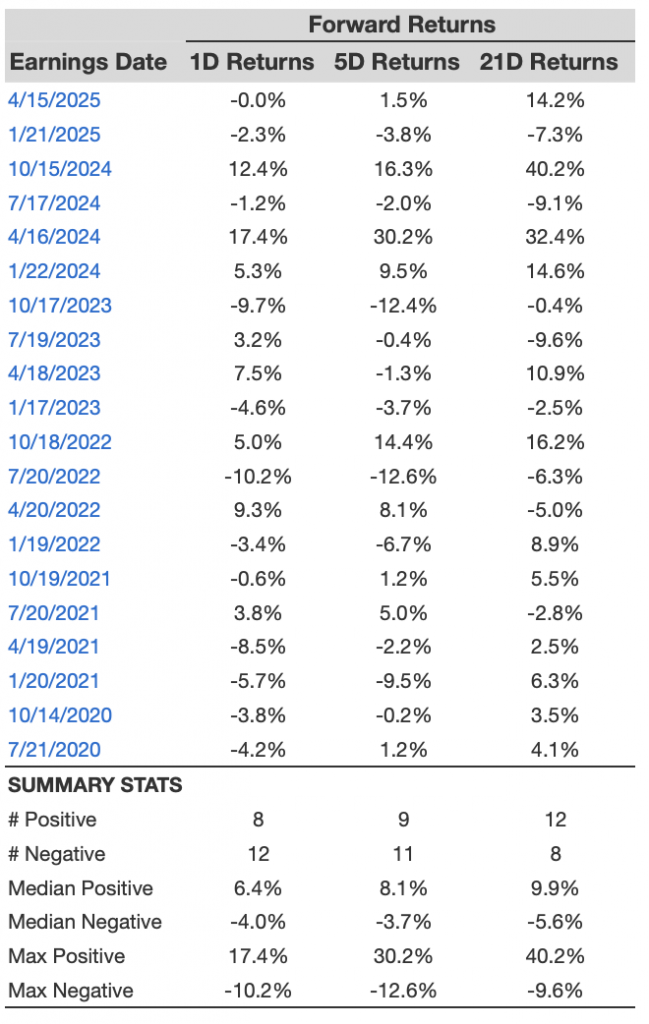 - There are 20 earnings data points recorded over the last five years, with 8 positive and 12 negative one-day (1D) returns observed. In summary, positive 1D returns were seen about 40% of the time.