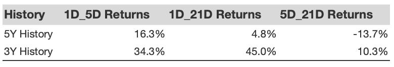Additional data for observed 5-Day (5D), and 21-Day (21D) returns post earnings are summarized along with the statistics in the table below.