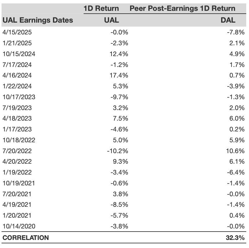 Sometimes, peer performance can have influence on post-earnings stock reaction. In fact, the pricing-in might begin before the earnings are announced. Here is some historical data on the past post-earnings performance of United Airlines stock compared with the stock performance of peers that reported earnings just before United Airlines. For fair comparison, peer stock returns also represent post-earnings one-day (1D) returns.