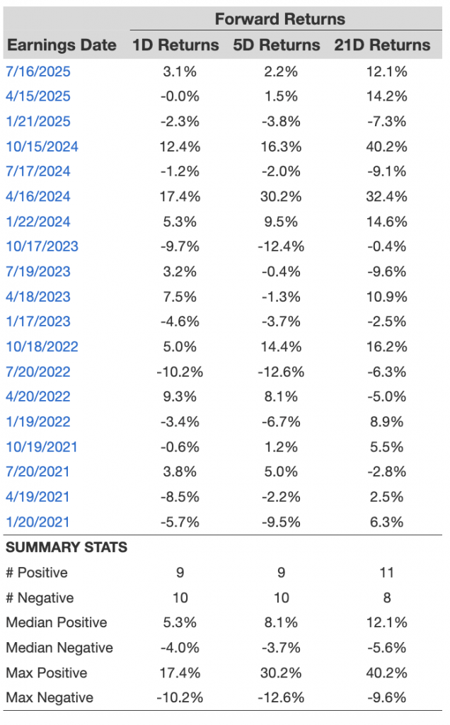 - There are 19 earnings data points recorded over the last five years, with 9 positive and 10 negative one-day (1D) returns observed. In summary, positive 1D returns were seen about 47% of the time.