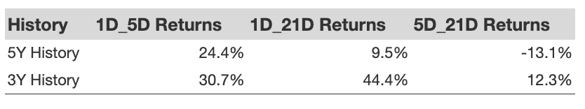 Additional data for observed 5-Day (5D), and 21-Day (21D) returns post earnings are summarized along with the statistics in the table below.