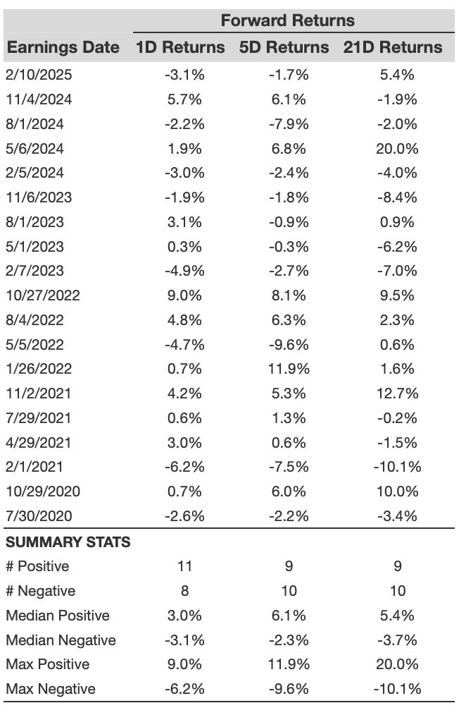 The market’s reaction will largely depend on how the actual results compare to these consensus figures and overall market expectations. However, historical data suggests potential trading strategies. One approach is to analyze the historical probability of positive returns and establish a position before the earnings announcement. Alternatively, traders can examine the correlation between immediate post-earnings returns and medium-term performance to inform positioning after the results are released.