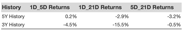 Additional data for observed 5-Day (5D), and 21-Day (21D) returns post earnings are summarized along with the statistics in the table below.