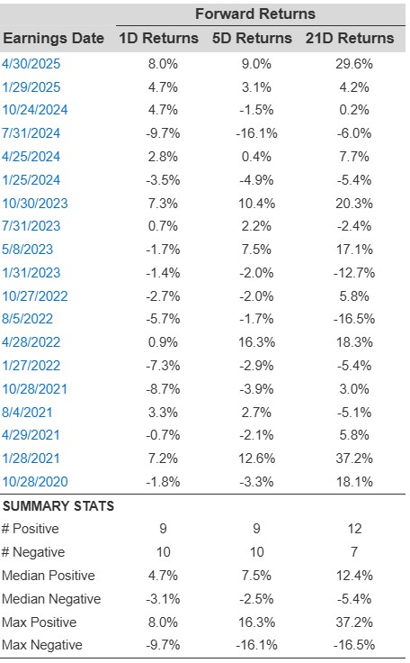 - There are 19 earnings data points recorded over the last five years, with 9 positive and 10 negative one-day (1D) returns observed. In summary, positive 1D returns were seen about 47% of the time.