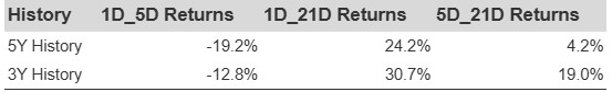 Additional data for observed 5-Day (5D), and 21-Day (21D) returns post earnings are summarized along with the statistics in the table below.