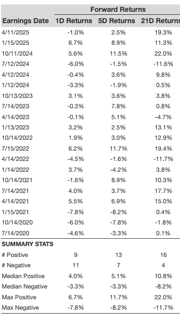 - There are 20 earnings data points recorded over the last five years, with 9 positive and 11 negative one-day (1D) returns observed. In summary, positive 1D returns were seen about 45% of the time.