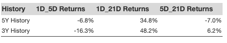 Additional data for observed 5-Day (5D), and 21-Day (21D) returns post earnings are summarized along with the statistics in the table below.