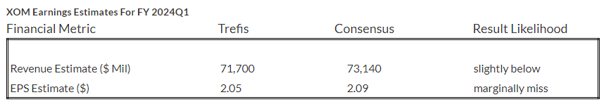 Exxon Mobil (NYSE: XOM), a leading explorer, producer, transporter, and seller of crude oil and natural gas, and North America’s largest energy company by market cap, is scheduled to announce its fiscal first-quarter results on Friday, April 26. We expect Exxon Mobil stock to likely trade lower with revenue and earnings both missing market expectations marginally. In a company filing, Exxon mentioned that changes in gas prices could have a negative impact of $200 million-$600 million on upstream earnings in the upcoming Q1. It expects to report ~$2.7 billion in Q1 impairments related to its upstream business, and said changes in oil prices would knock as much as $400 million from upstream earnings in the quarter compared with Q4 2023’s $4.1 billion total. The company also reported a $500 million-$700 million increase in refining earnings would be more than offset by $900K-$1.3 billion in losses from timing effects primarily related to unsettled derivatives.