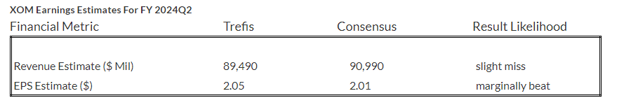 Trefis estimates Exxon Mobil’s Q2 2024 revenues to be around $89.5 Bil, slightly below the consensus estimate. In Q1, XOM’s revenue fell 4% year-over-year (y-o-y) to $83.1 billion, as oil refining margins and natural gas prices fell from post-Covid peaks. Exxon offset some of the decline as oil production rose faster than expected from its Guyana venture, where output reached more than 600K barrels of oil equivalent (boe)/day after producing 440K boe/day in Q4 2023, and its refineries produced a record amount of fuel for any Q1, with throughput of 3.84B barrels (bbl)/day, down 4% yo-y. Q1 worldwide oil production rose 2.5% y-o-y to 2.55 billion bbl/day, as a 0.5% drop in the U.S. and a 5% decline in Asia was offset by a 15.2% boost in Canada and other Americas and a 1.8% gain in Africa. However, net natural gas production available for sale fell 8.2% to 7.36 billion cubic feet/day.