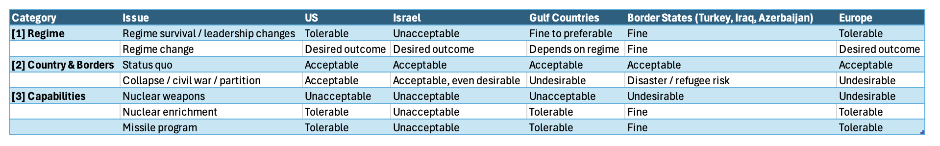 The U.S. and Israel both want regime change. The Gulf states are more cautious — they would accept regime change, but only if what follows isn’t chaos on their doorstep. Iran collapsing into civil war or partition would suit Israel fine. For Iraq, Turkey, and Azerbaijan, it would be a refugee and stability disaster. Europe wants regime change in the abstract but will not tolerate prolonged economic disruption or mass civilian casualties.